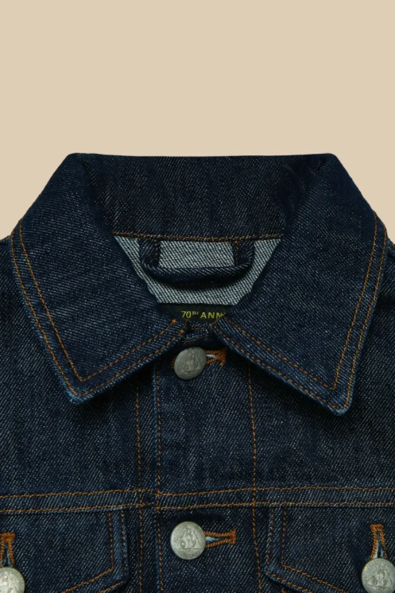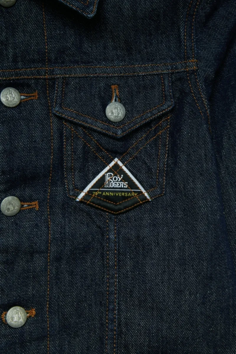 Giacca classica di manifattura italiana in denim con lavaggio scuro. Chiusura sul fronte con bottoni logati. Maniche lunghe e polsini con bottoni. Due tasche piatte sul petto con patta e bottone, e due tasche a filetto sul fronte. Label Roy Roger’s 70 Anniversary applicato su una tasca. Regular fit. COMPOSIZIONE: 100% COTONE.