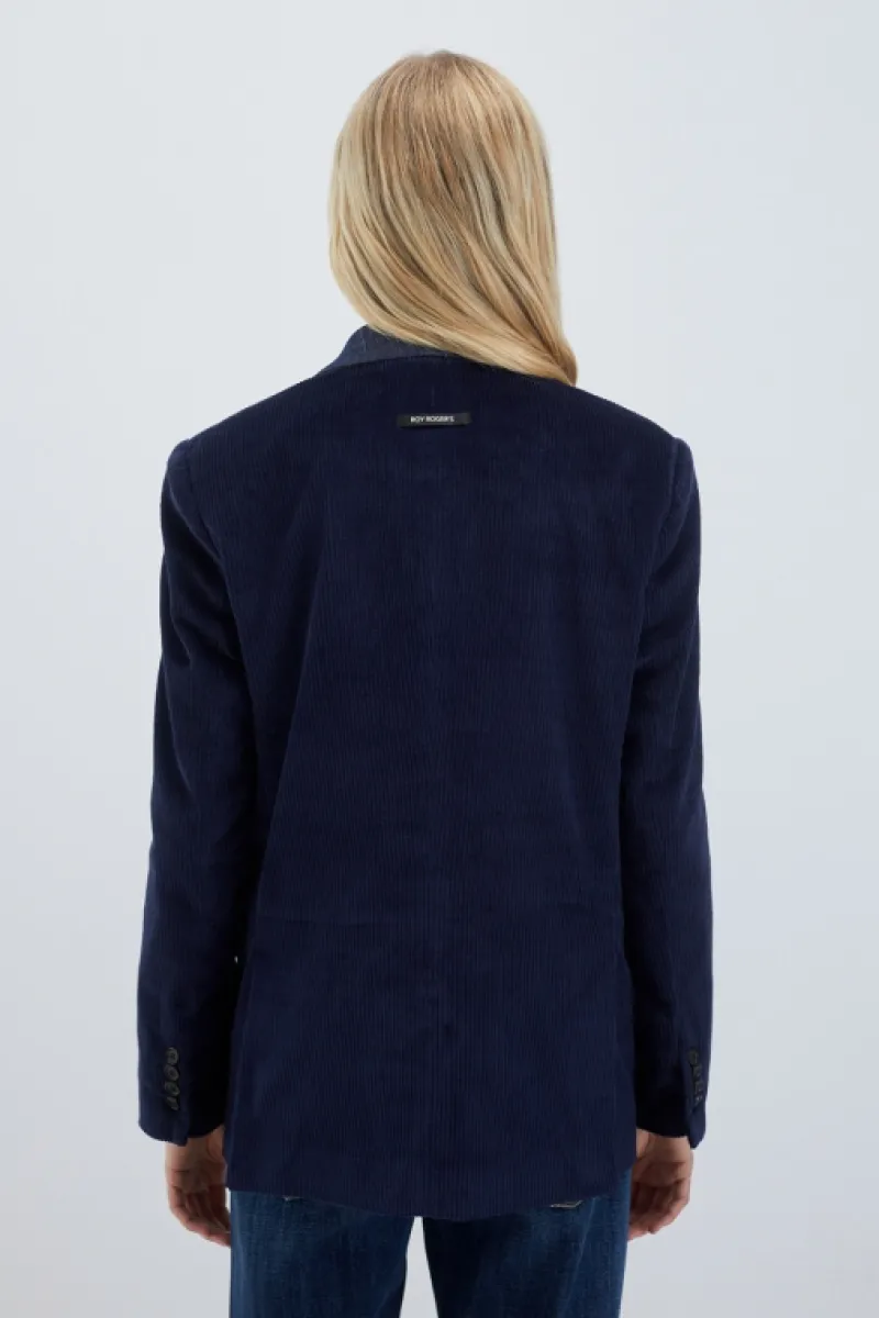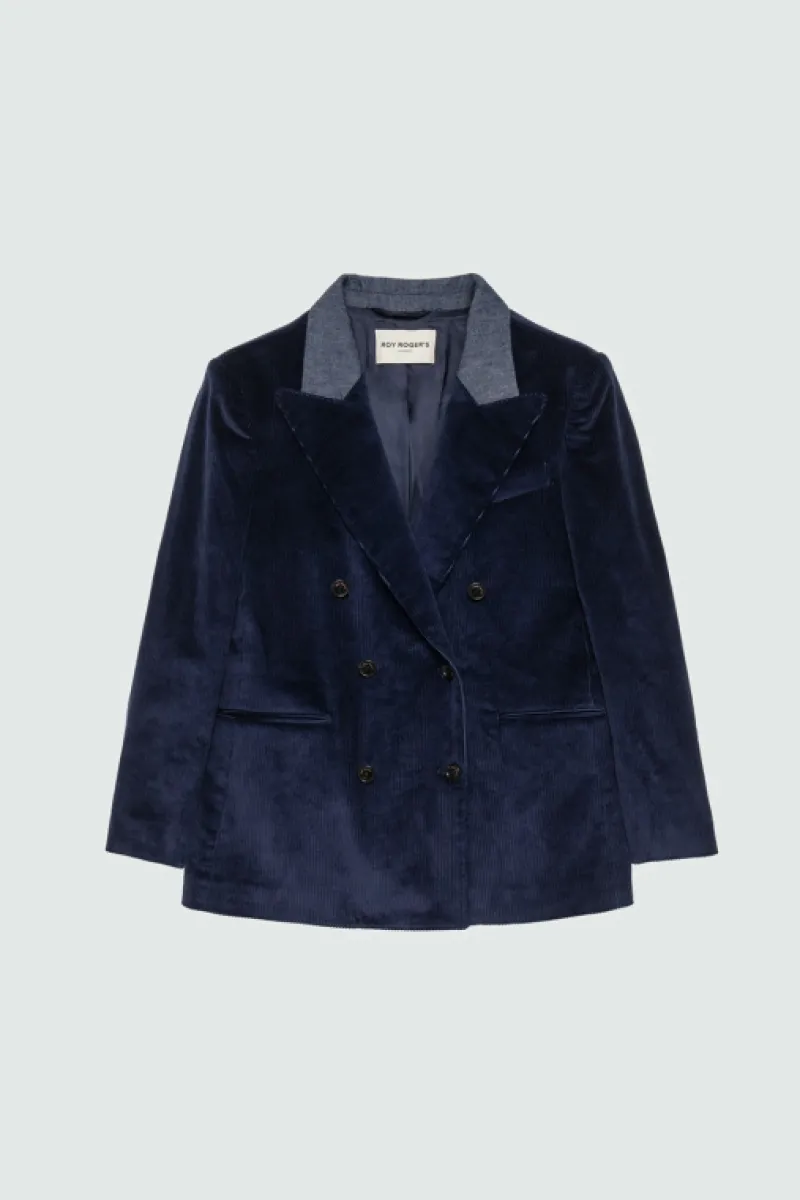 Blazer doppiopetto in velluto a coste tinta unita. Spalle imbottite. Collo reverse con dettaglio in denim in tono. Chiusura con bottoni logati. Tasche a filetto sul fronte e taschino sul petto. Maniche lunghe e polsini con bottoni. Label Roy Roger’s applicata sul retro e spacchi laterali. Fodera in tono. Regular fit. COMPOSIZIONE: 100% COTONE.