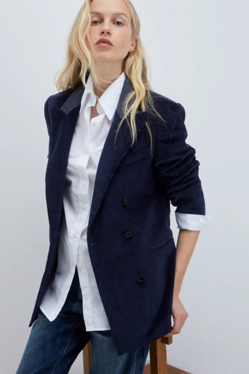 Blazer doppiopetto in velluto a coste tinta unita. Spalle imbottite. Collo reverse con dettaglio in denim in tono. Chius…