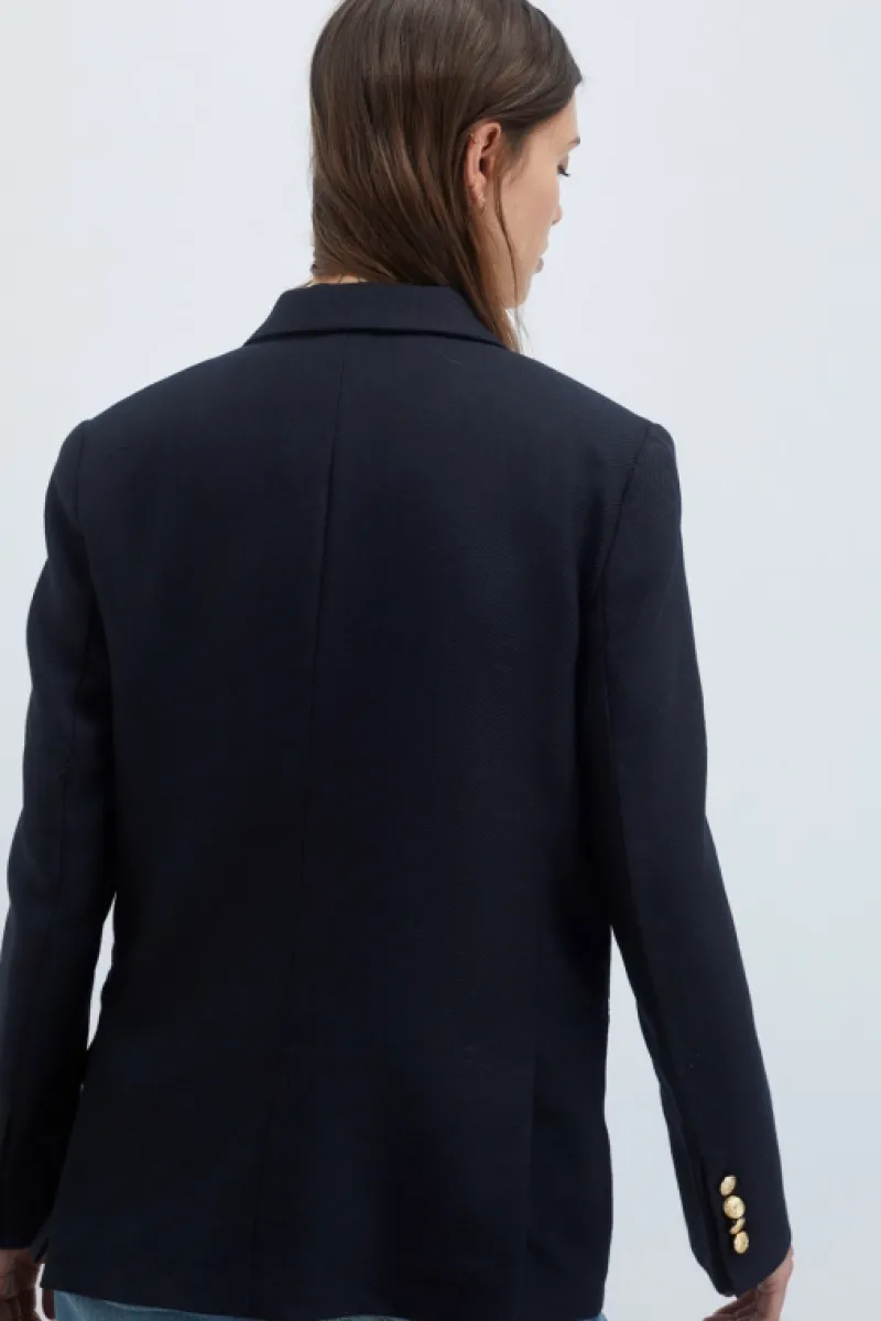 Blazer doppiopetto in lana twill tinta unita. Spalle imbottite. Collo reverse. Chiusura con bottoni logati. Tasche a fil…