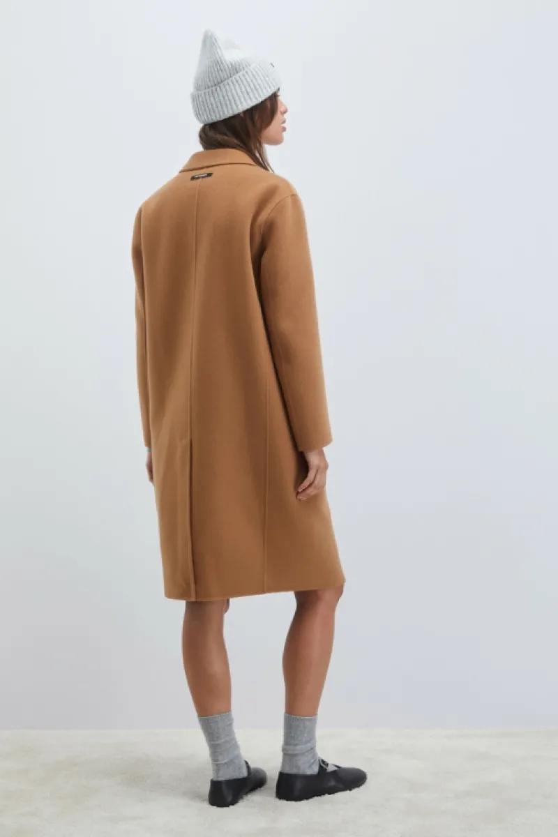 Cappotto doppiopetto in lana tinta unita. Collo reverse. Chiusura con bottoni tartarugati. Tasche oblique sul fronte. Ma…