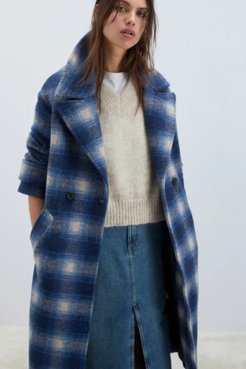 Cappotto doppiopetto in lana con motivo check. Collo reverse. Chiusura con bottoni tartarugati. Tasche oblique sul front…