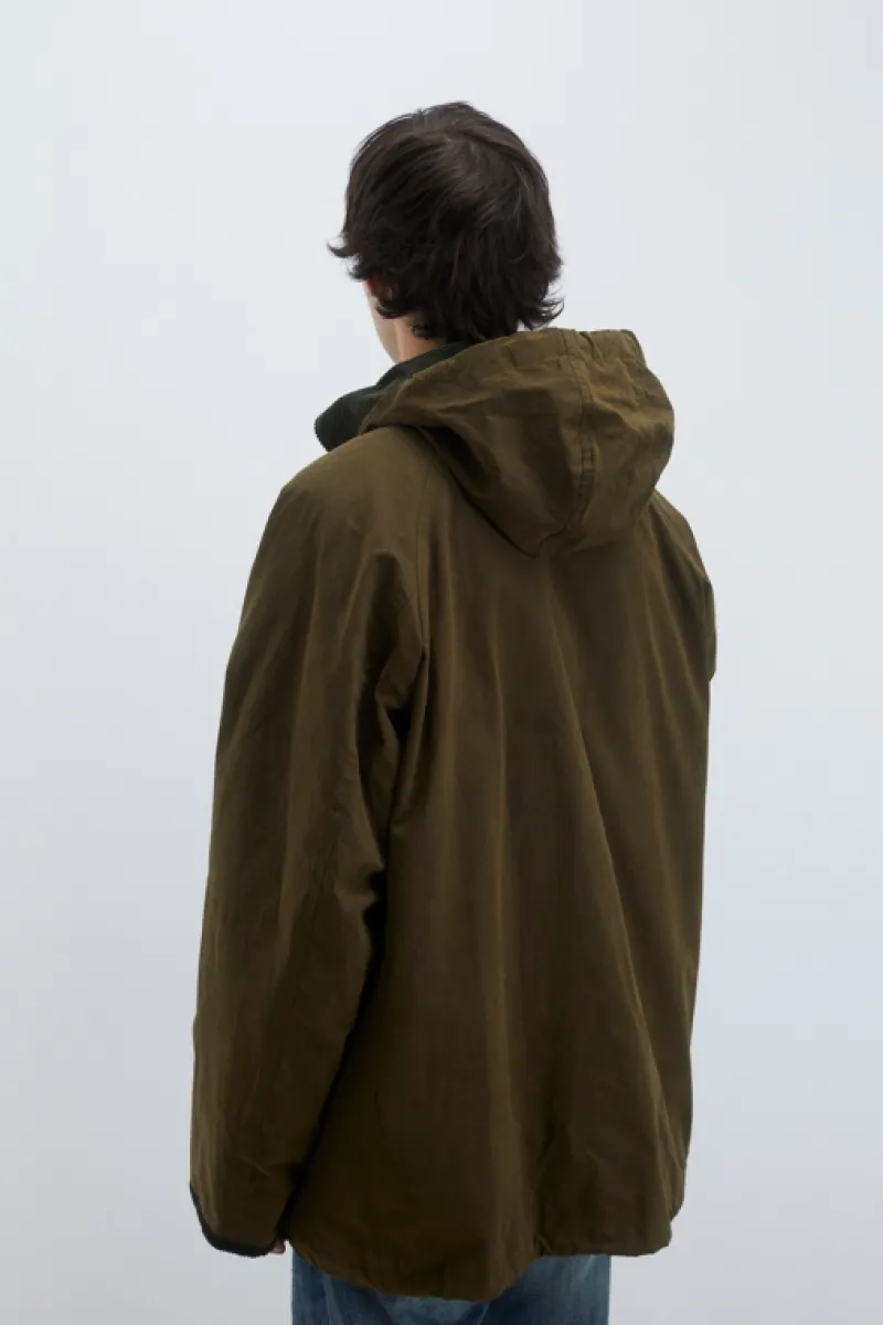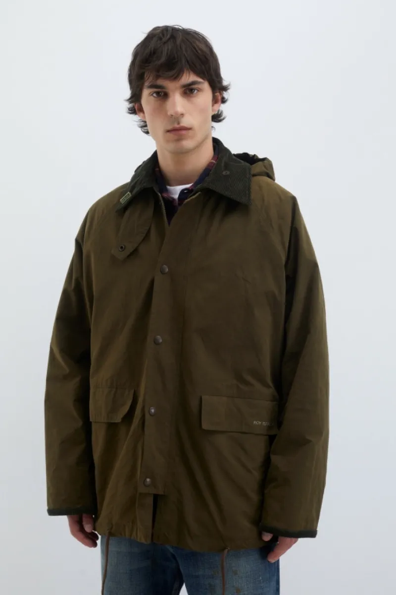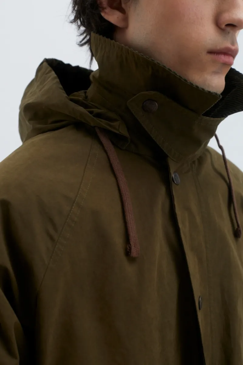 Giacca Balmoral in cotone waxed tinta unita. Colletto classico in velluto a coste. Cappuccio in tono regolabile con coul…