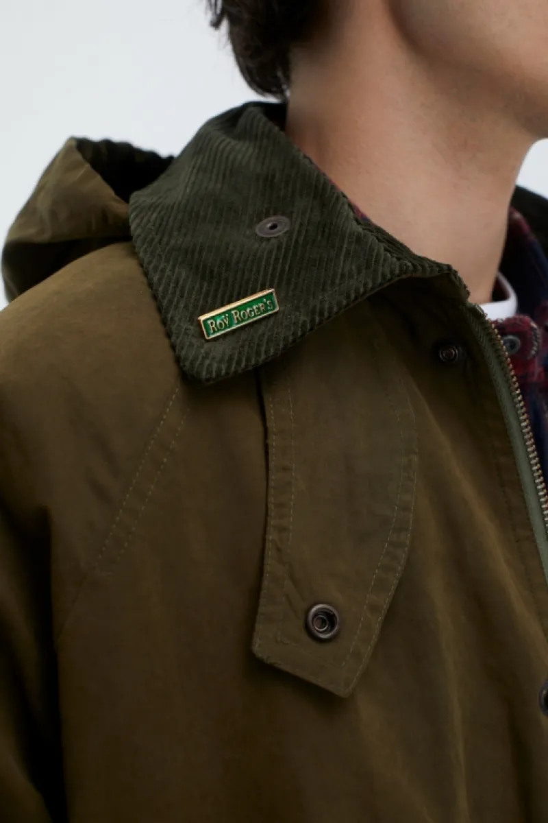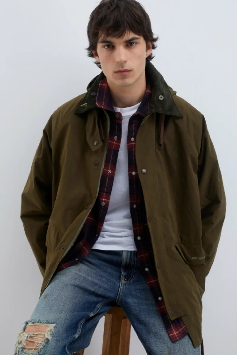 Giacca Balmoral in cotone waxed tinta unita. Colletto classico in velluto a coste. Cappuccio in tono regolabile con coulisse. Chiusura con bottoni a pressione logati e zip. Tasconi sul fronte con patta e apertura laterale. Logo Roy Roger’s ricamato in tono. Maniche lunghe e polsini rifiniti in velluto a costine. Fodera in tessuto sale e pepe. Regular fit. COMPOSIZIONE: 45% COTONE 39% POLIESTERE 16% POLIAMMIDE.