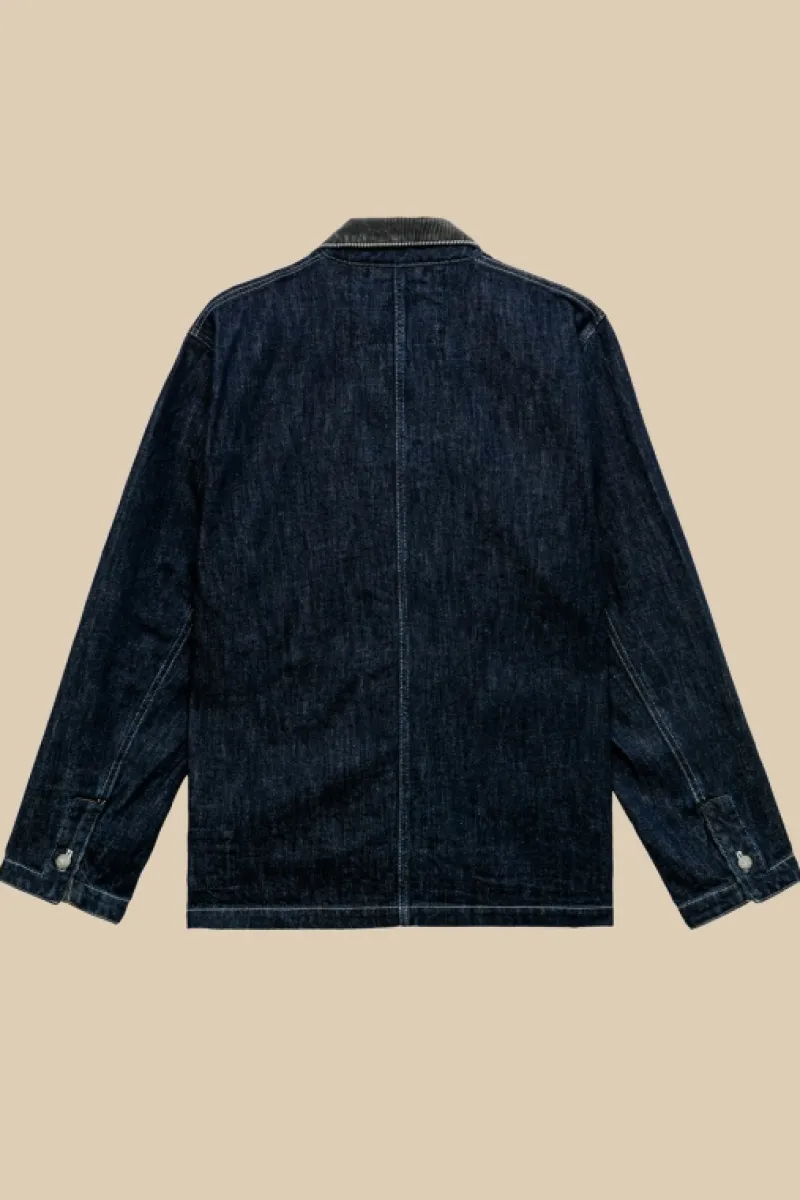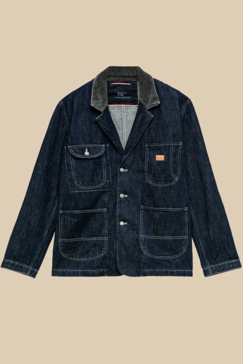 Giacca da lavoro di manifattura italiana in denim con lavaggio scuro. Collo reverse con dettaglio in velluto a coste in contrasto. Chiusura con bottoni logati. Maniche lunghe e polsini con bottoni. Tasche piatte sul fronte e sul petto. Patch Roy Roger’s applicata su una tasca. Regular fit. COMPOSIZIONE: 100% COTONE.