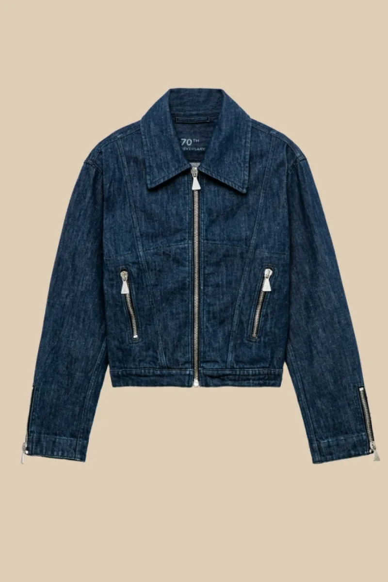 Giubbotto in jeans con chiusura zip e tasche laterali in zip ispirato ad un modello degli anni 60, con uno stile che rimanda al mondo biker.