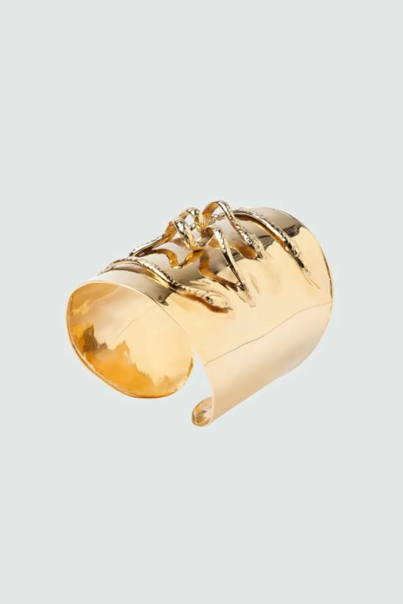 Bracciale serpente realizzato artigianalmente a Firenze dalla designer di gioielli Bona Tondinelli. Presenta un corpo a fascia alta in ottone placcato oro, arricchito da serpenti in rilievo sul fronte, che rimandano al mondo ellenico. Ogni irregolarità è un dettaglio prezioso, che rende questo gioiello speciale ed unico. Made in Italy.