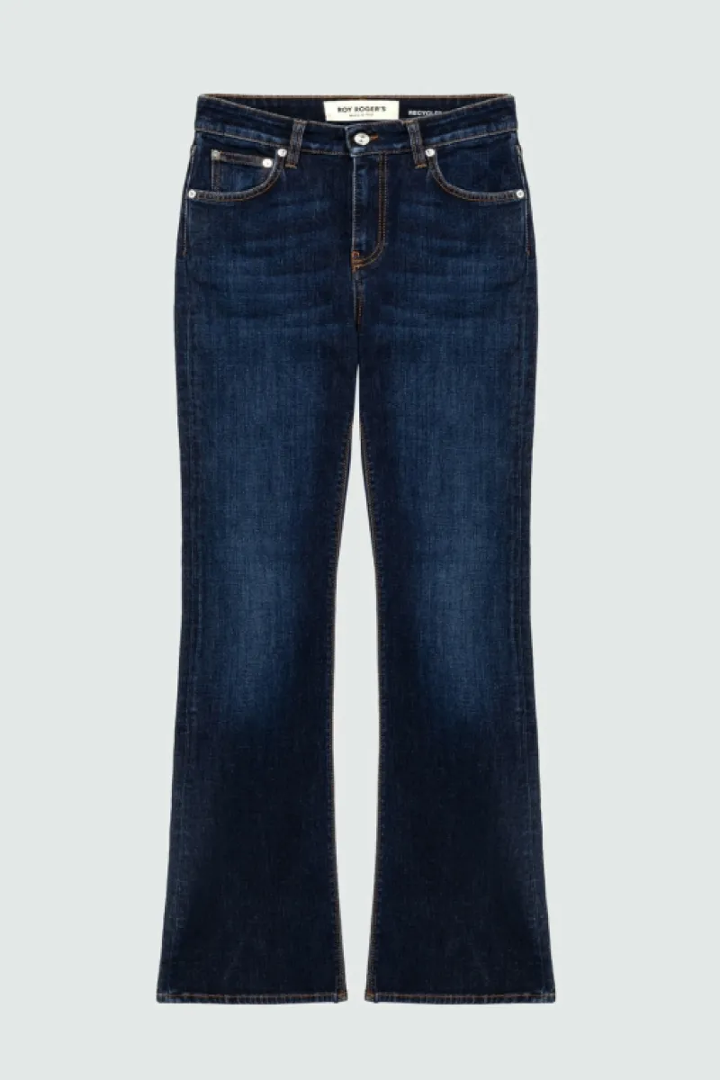 Jeans in denim recycled con lavaggio scuro e impunture in contrasto. Vita media con passanti. Chiusura con bottone logato e zip. Due tasche sul fronte e due tasche sul retro con label Roy Roger’s applicata. Flare fit. COMPOSIZIONE: 79% COTONE 20% POLIESTERE 1% ELASTAN.