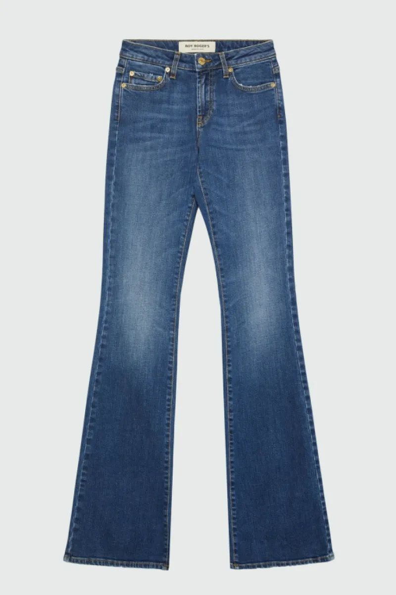 Jeans in denim con lavaggio scuro. Vita media con passanti. Chiusura con bottone logato e zip. Due tasche sul fronte e due tasche sul retro con label Roy Roger’s applicata. Flare fit. COMPOSIZIONE: 98% COTONE 2% ELASTAN.