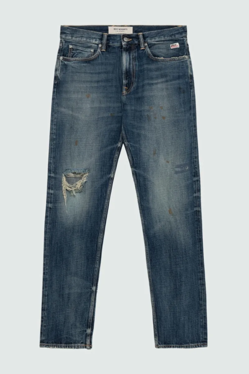 Jeans in denim Royal research con lavaggio scuro e leggero effetto washed. Vita media con passanti e salpa applicata sul retro. Chiusura con bottone logato e zip. Due tasche sul fronte e due tasche sul retro con label Roy Roger’s applicata. Regular fit. COMPOSIZIONE: 100% COTONE.