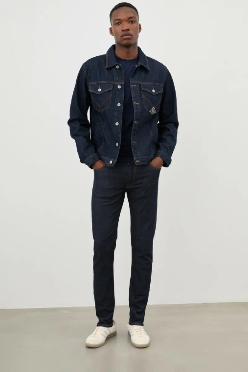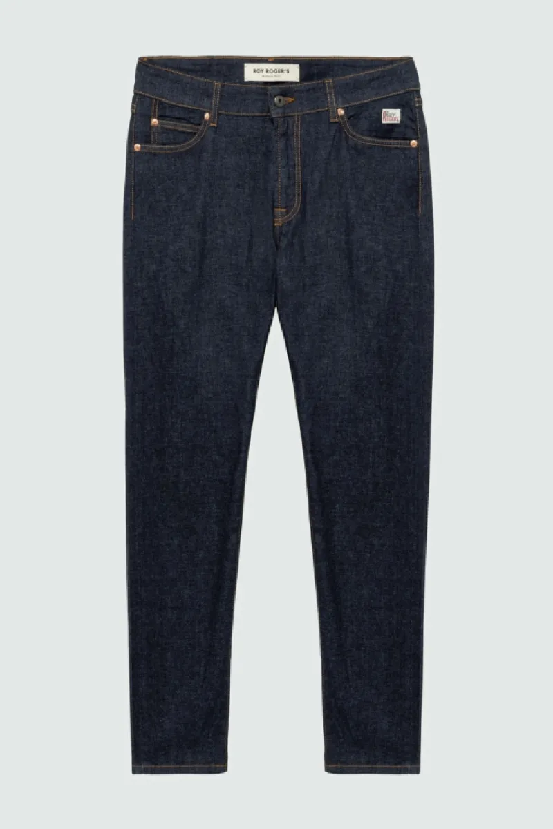 Jeans in denim one wash con lavaggio scuro e impunture in contrasto. Vita media con passanti e salpa applicata sul retro. Chiusura con bottone logato e zip. Due tasche sul fronte e due tasche sul retro con label Roy Roger’s applicato. Slim fit. COMPOSIZIONE: 98% COTONE 2% ELASTAN.