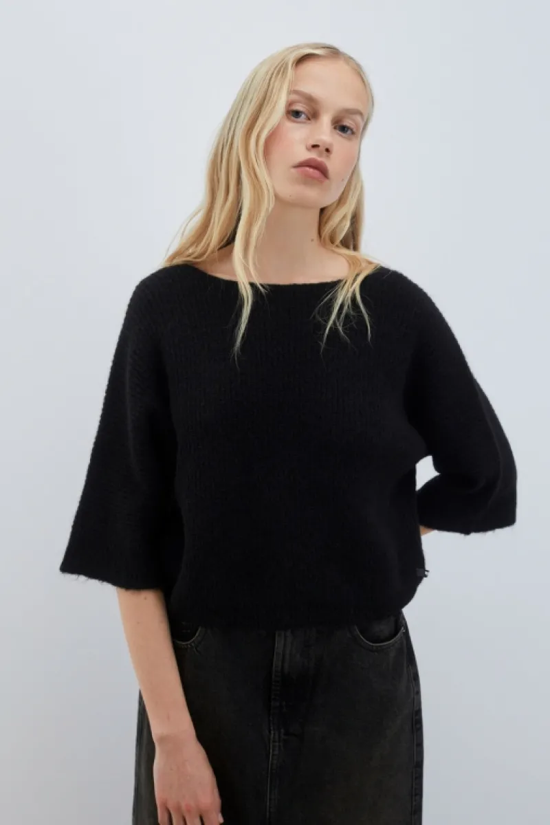 Cardigan reverse in Alpaca a coste tinta unita. Scollo a V e scollo tondo sul fronte. Chiusura sul retro con bottoni gioiello. Maniche 3/4 ampie senza giromanica. Label Roy Roger’s applicata sul retro di lato. Relaxed fit. COMPOSIZIONE: 28% ALPACA 31% ACRILICO 30% POLIAMMIDE 10% LANA 1% ELASTAN.