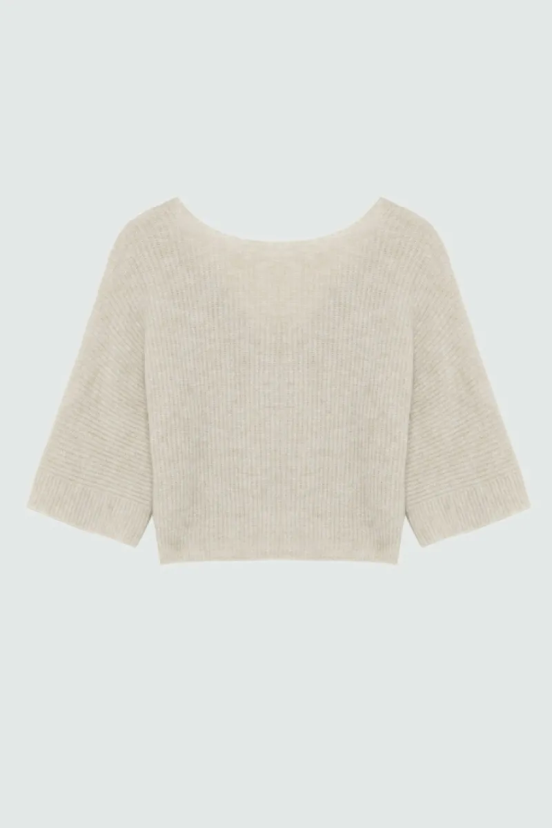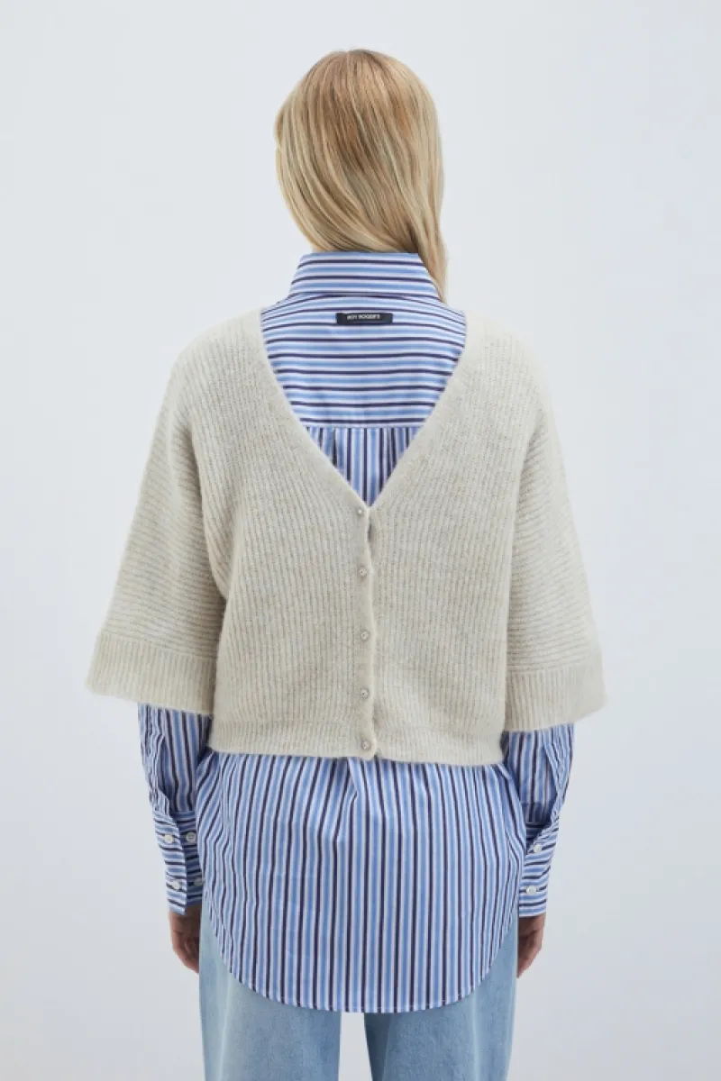 Cardigan reverse in Alpaca a coste tinta unita. Scollo a V e scollo tondo sul fronte. Chiusura sul retro con bottoni gioiello. Maniche 3/4 ampie senza giromanica. Label Roy Roger’s applicata sul retro di lato. Relaxed fit. COMPOSIZIONE: 28% ALPACA 31% ACRILICO 30% POLIAMMIDE 10% LANA 1% ELASTAN.