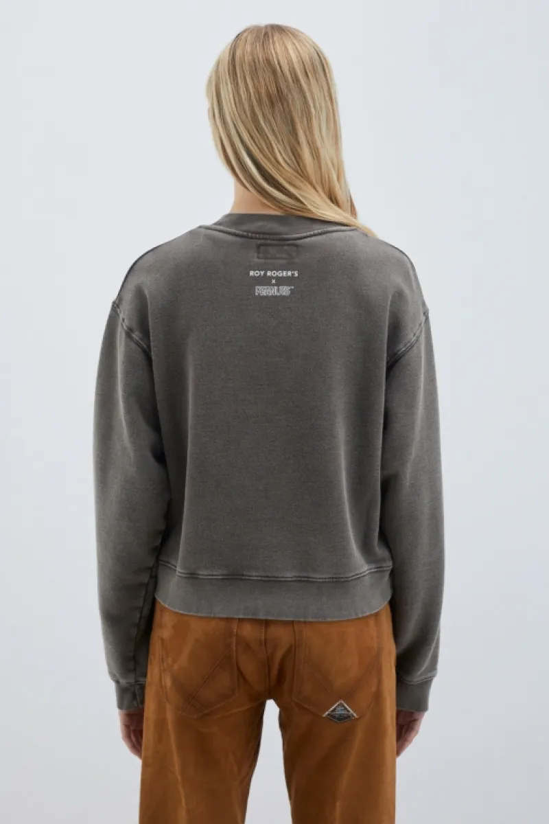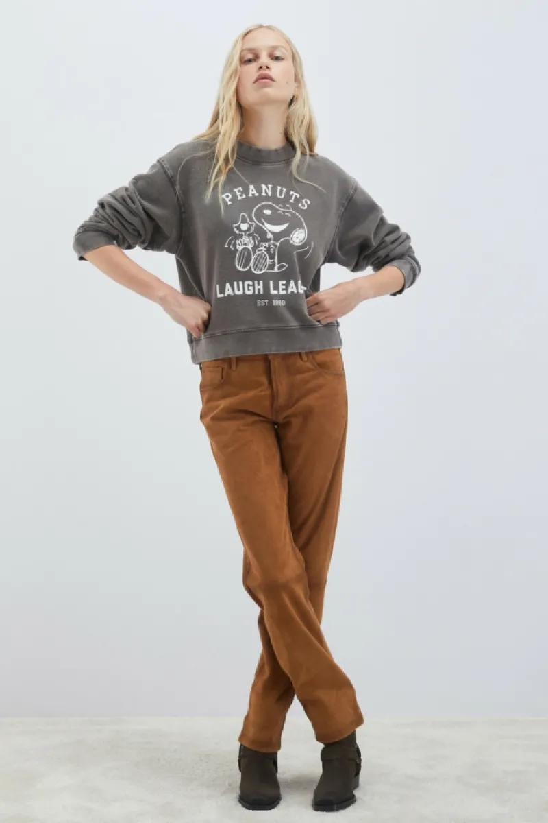 Felpa girocollo nata dalla collaborazione tra Roy Roger’s e Peanuts in cotone washed tinta unita. Stampa Peanuts Laugh L…