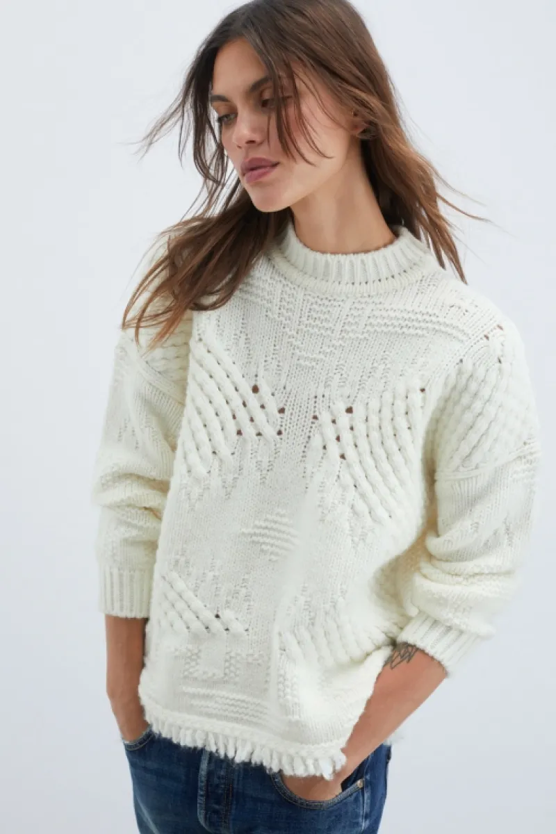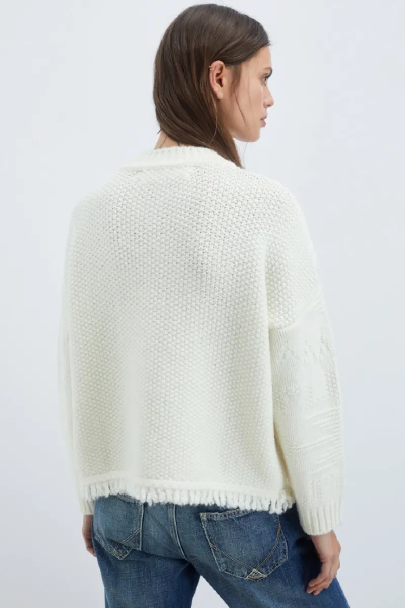 Maglia girocollo in lana Multigauge con diverse lavorazioni tinta unita Maniche lunghe con spalla leggermente scesa. Collo e polsini a coste e fondo sfrangiato. Regular fit. COMPOSIZIONE: 65% ACRILICO 28% LANA 6% POLIAMMIDE 1% ELASTAN.