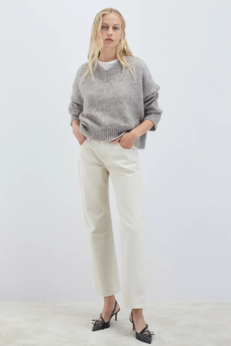 Maglia scollo V in misto mohair tinta unita. Maniche lunghe con spallascesa. Collo, polsini e fondo a costine. Label Roy…