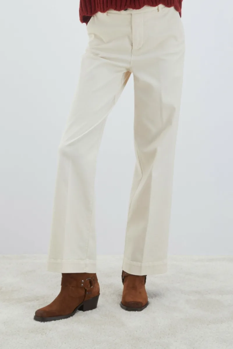 Pantalone Lais in tessuto soft tinta unita. Vita media con passanti. Chiusura con bottone logato asimmetrico e zip. Tasc…