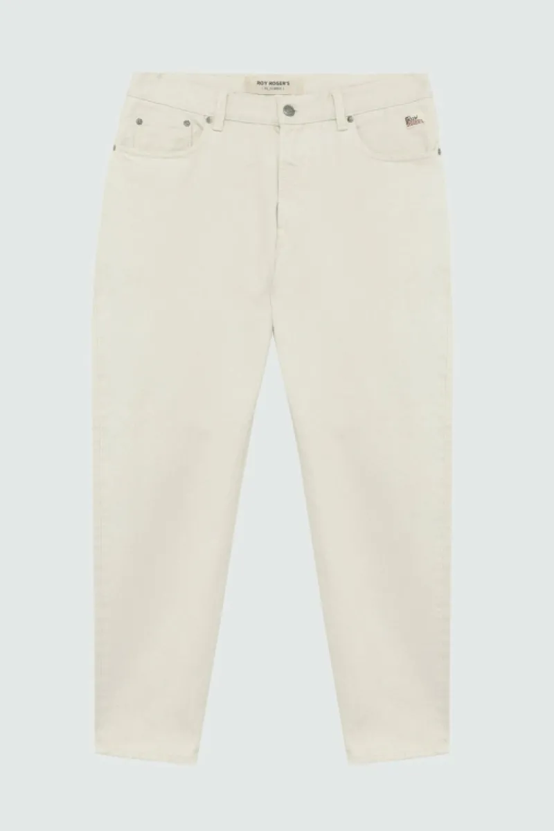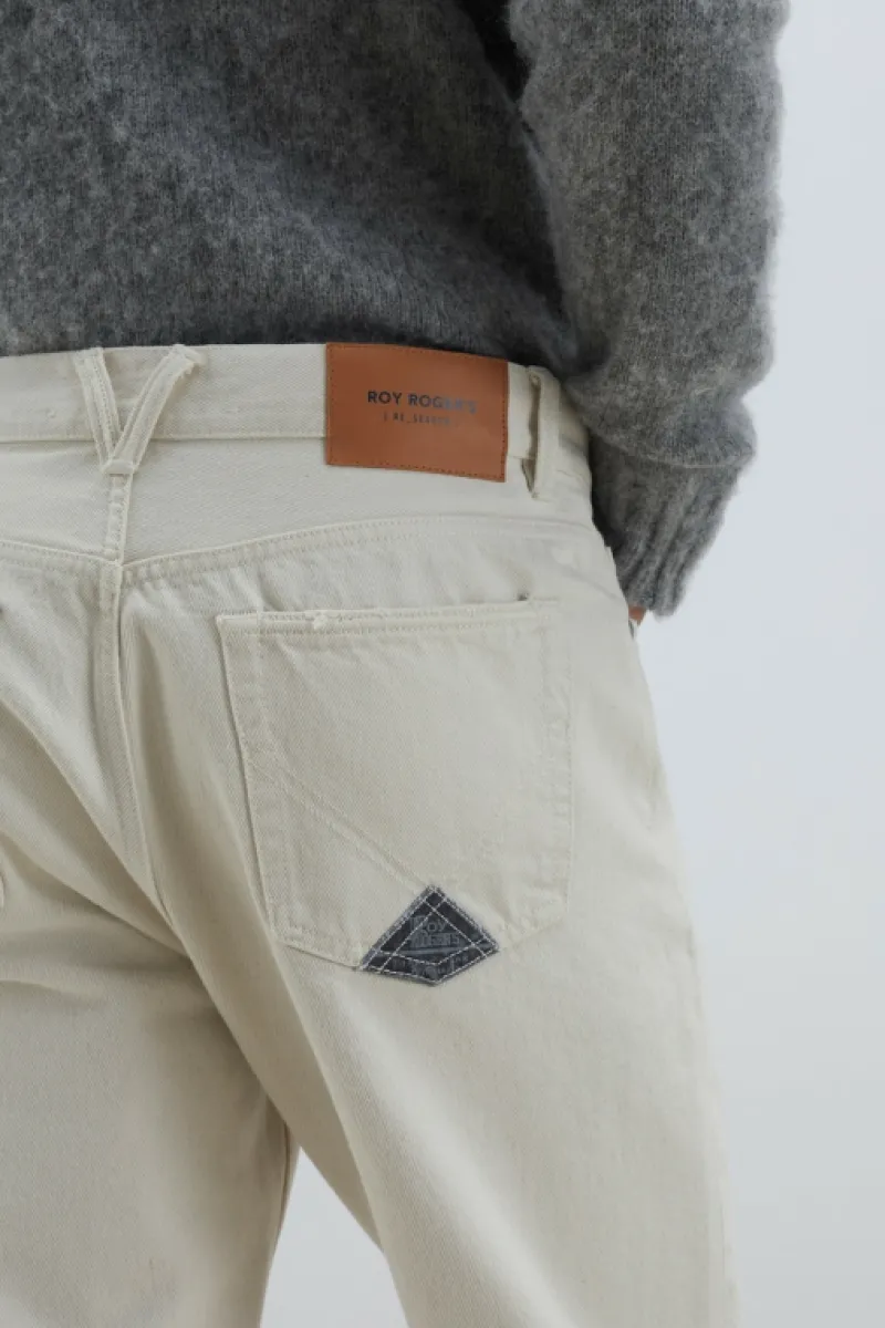Jeans research in denim bull effetto naturale e leggero effetto used. Vita media con passanti e salpa applicata sul retro. Chiusura con bottone logato e zip. Due tasche sul fronte e due tasche sul retro con label Roy Roger’s applicata. Carrot fit. COMPOSIZIONE: 100% COTONE.