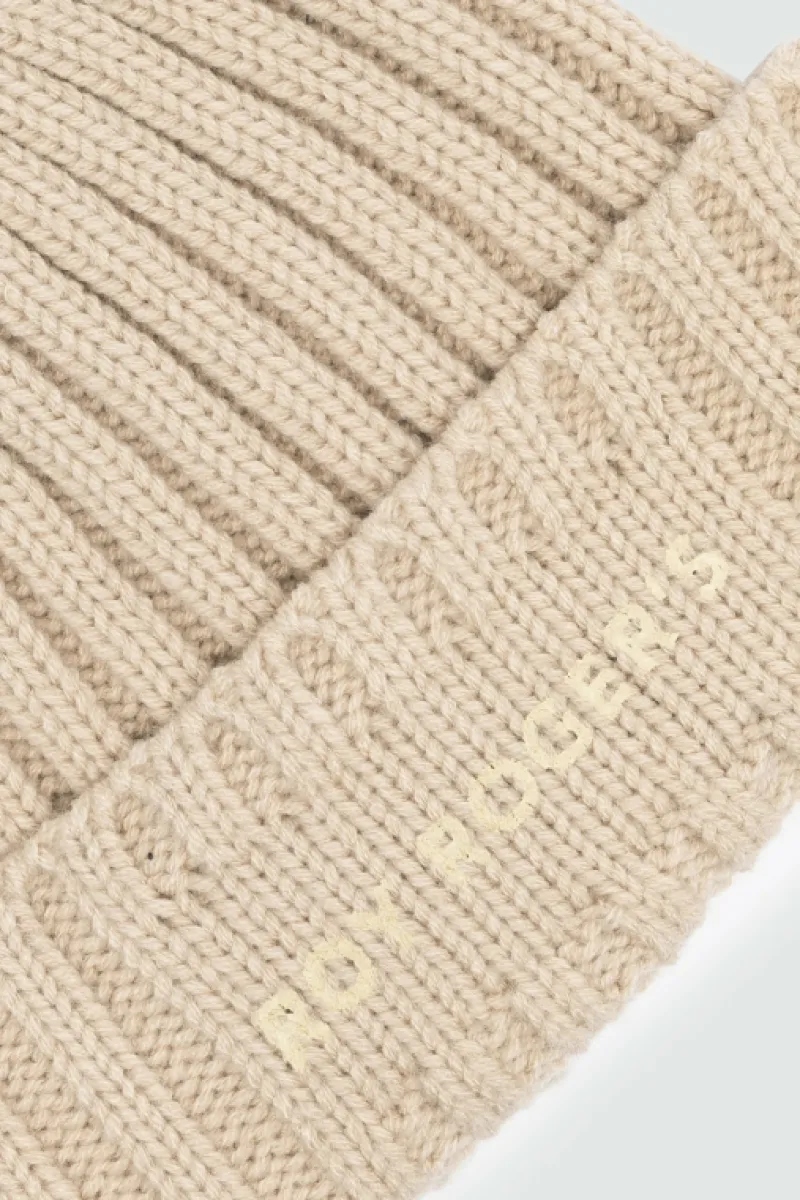 Cappello Beanie Fisherman in maglia yarn a coste tinta unita.Fondo con maxi reverse e logo Roy Roger’s stampato. COMPOSI…