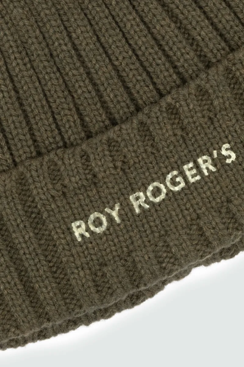 Cappello Beanie Fisherman in maglia yarn a coste tinta unita.Fondo con maxi reverse e logo Roy Roger’s stampato. COMPOSI…