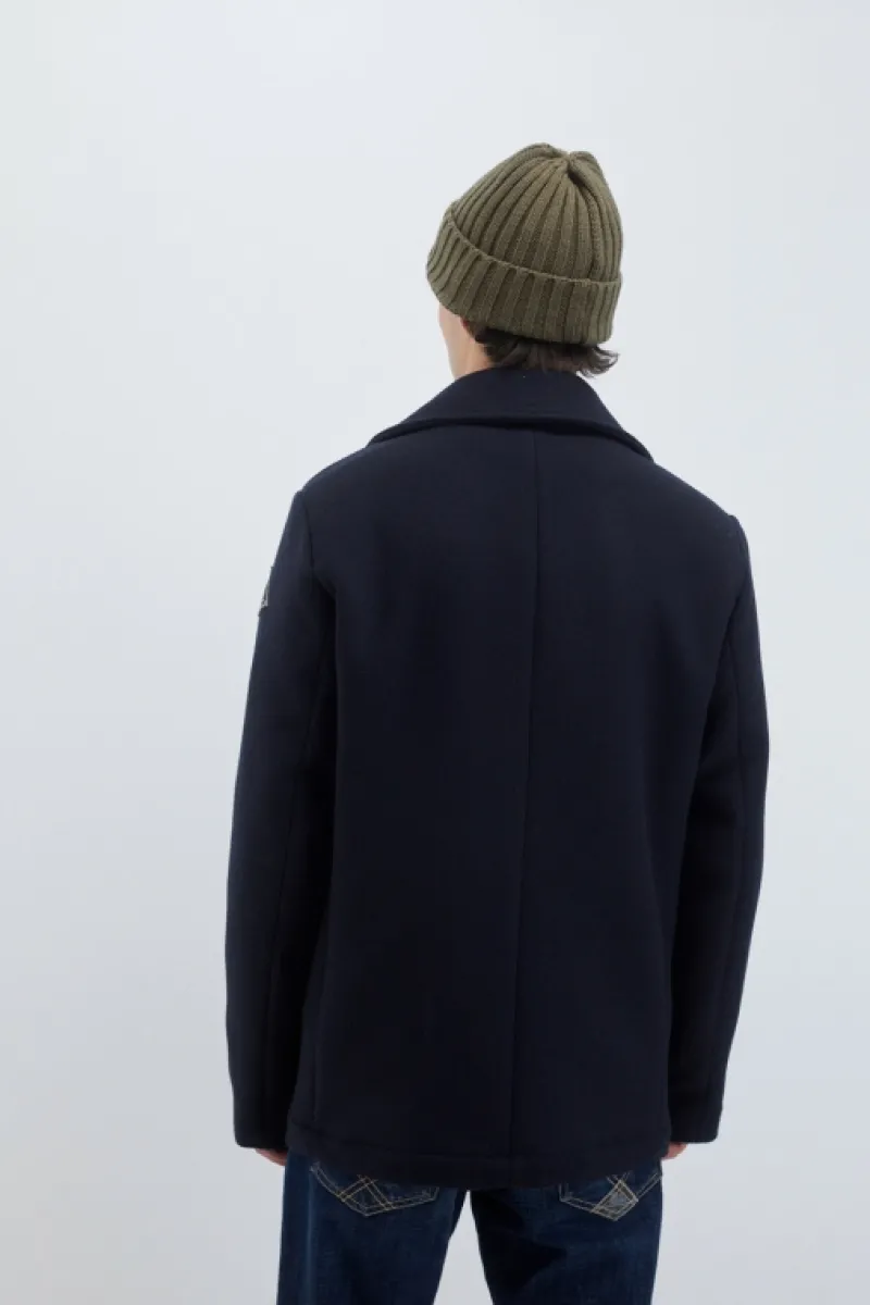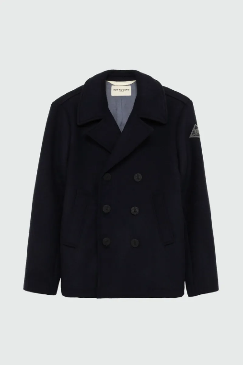 Cappotto Melton in misto lana tinta unita. Collo reverse. Chiusura doppiopetto con bottoni marinier.Patch Roy Roger’s in…