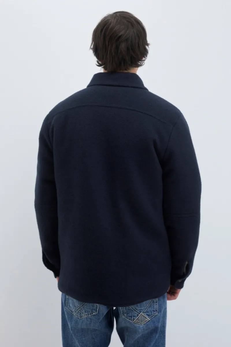 Giacca Melton in misto lana tinta unita. Colletto classico. Chiusura con bottoni logati. Tasche piatte sul petto con pat…