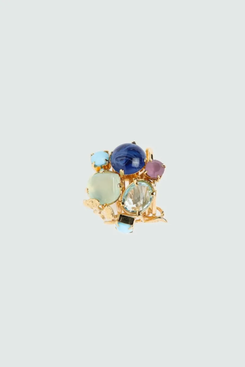 Anello Fancy, realizzato artigianalmente a Firenze dalla designer di gioielli Bona Tondinelli. Presenta un corpo a fascia in ottone placcato oro, impreziosito da rilievi floreali, perle e luminosi cristalli rossi. Ogni irregolarità è un dettaglio prezioso, che rende questo gioiello speciale ed unico. Regolabile. Made in Italy.