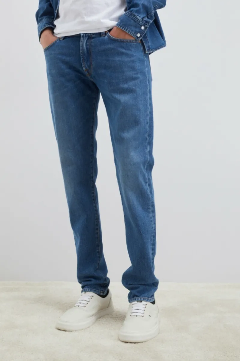 Jeans in denim con lavaggio scuro e impunture in contrasto. Vita media con passanti e salpa applicata sul retro. Chiusur…