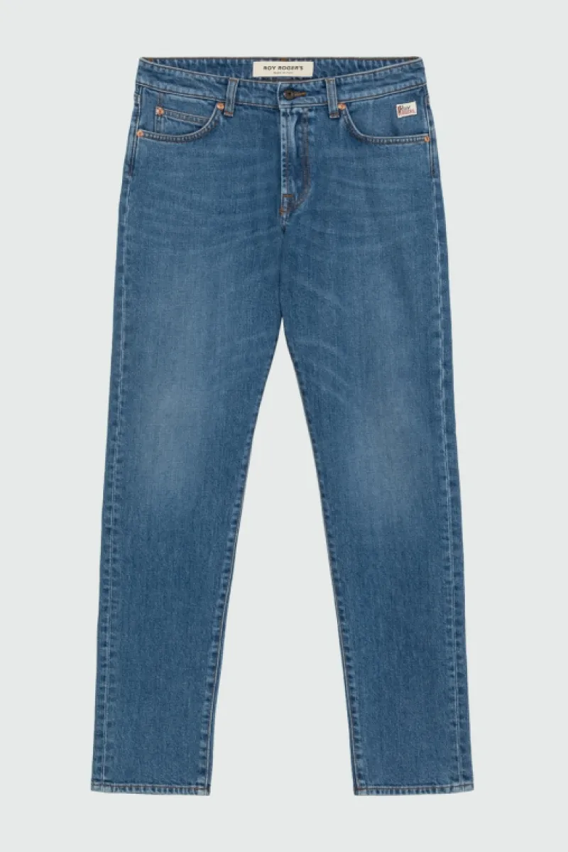 Jeans in denim con lavaggio scuro e impunture in contrasto. Vita media con passanti e salpa applicata sul retro. Chiusura con bottone logato e zip. Due tasche sul fronte e due tasche sul retro con label Roy Roger’s applicata. Slim fit. COMPOSIZIONE: 99% COTONE 1% ELASTODIENE.