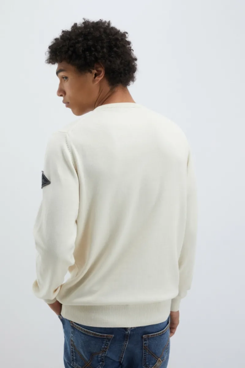 Maglia girocollo in cotone tinta unita con motivo punto spillo sul fronte. Maniche lunghe. Collo, polsini e fondo a costine. Patch Roy Roger’s in denim applicata su una manica. Regular fit. COMPOSIZIONE: 100% COTONE.