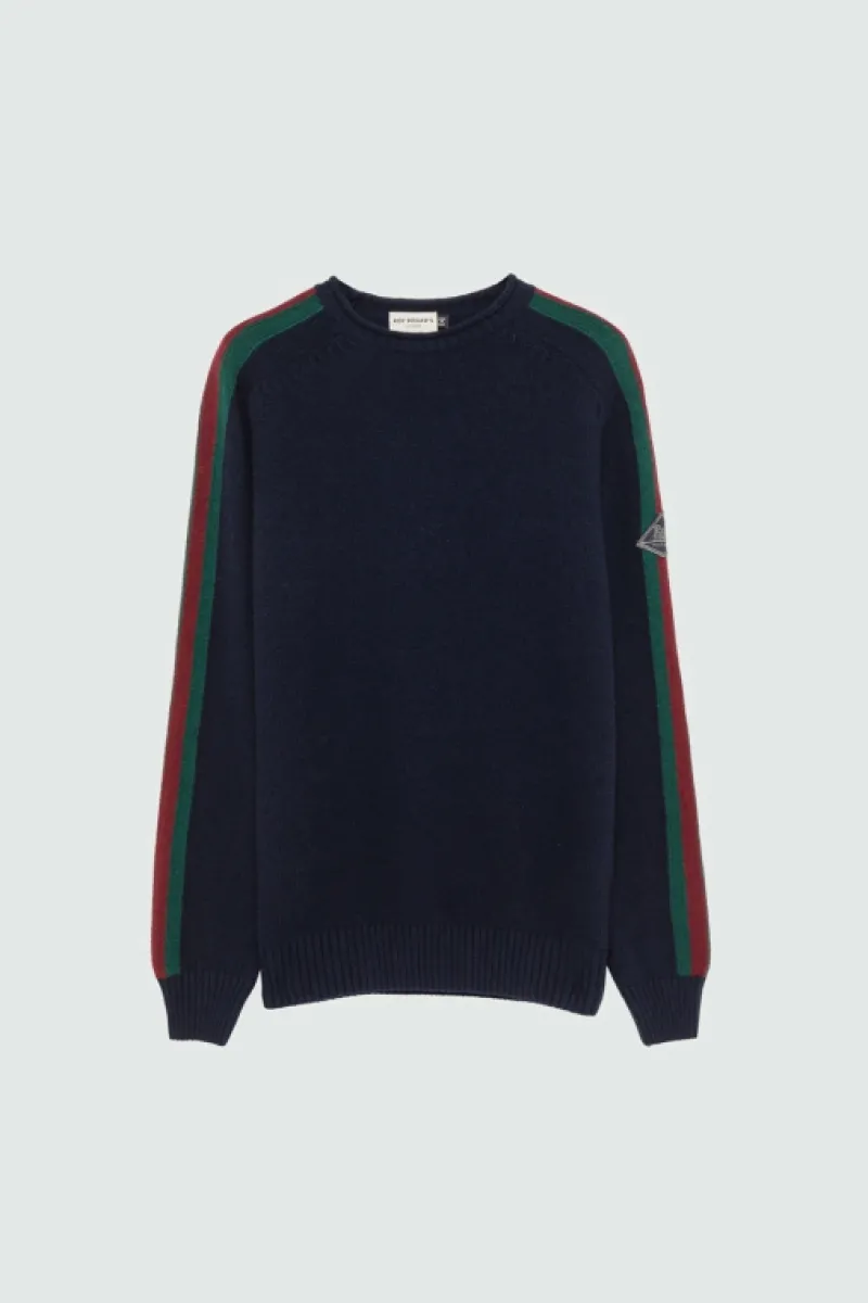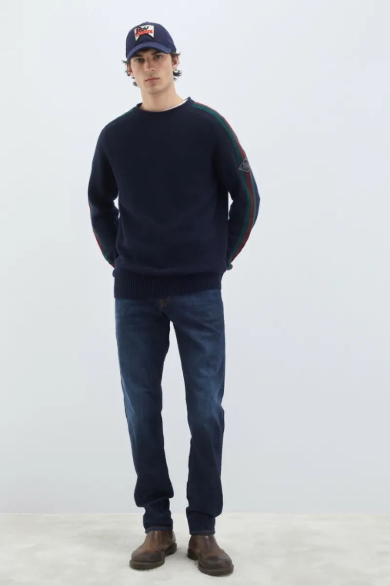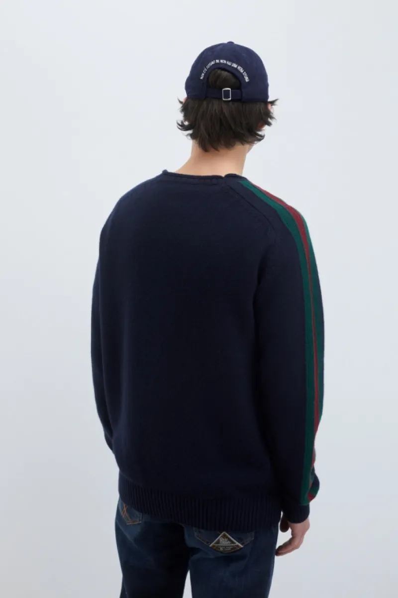 Maglia girocollo in lana e cashmere tinta unita con dettagli in contrasto di colore. Maniche lunghe raglan con bande bicolore. Collo, polsini e fondo a costine. Patch Roy Roger’s in denim applicata su una manica. Regular fit. COMPOSIZIONE: 45% LANA 25% VISCOSA 25% NYLON 5% CASHMERE.